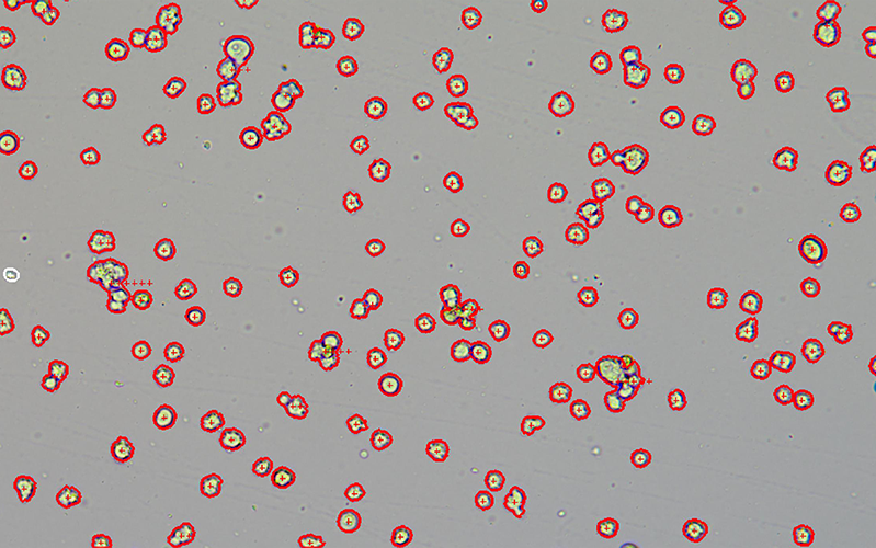 步驟二:查看識(shí)別圖,人工檢查軟件識(shí)別情況,一個(gè)加號(hào)代表一顆細(xì)胞;軟件對(duì)聚團(tuán)細(xì)胞進(jìn)行合理拆分,且清晰可查。