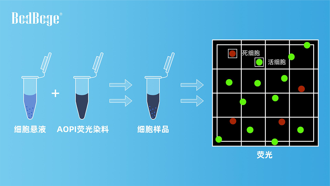 原理:AOPI熒光染料因其只與DNA和RNA結(jié)合的特性——既活細(xì)胞呈現(xiàn)綠色,死細(xì)胞呈現(xiàn)紅色,利用AOPI染色法,可排除雜質(zhì)對(duì)目標(biāo)細(xì)胞的干擾,快速區(qū)分活/死細(xì)胞。