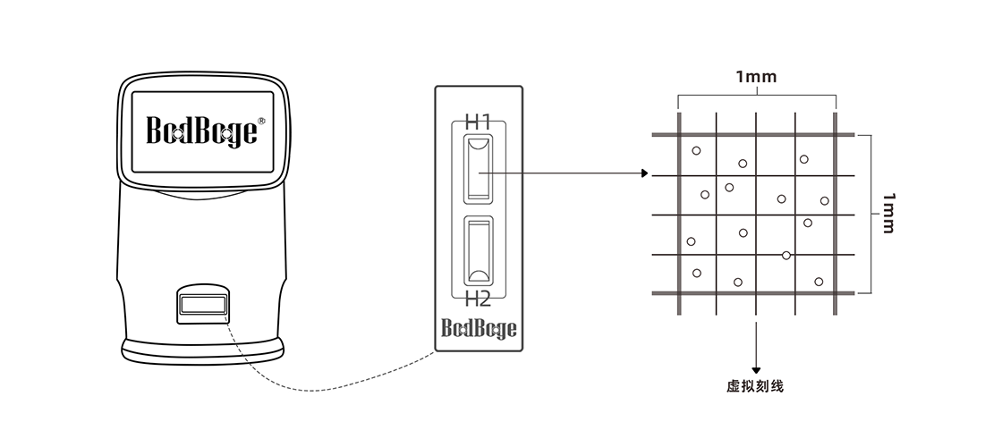 ②在使用一次性細(xì)胞計數(shù)片時,儀器屏幕會顯示虛擬刻線,刻線對應(yīng)的實際大小經(jīng)“仿細(xì)胞校準(zhǔn)板(發(fā)明專利號:ZL 2020 21855359.4)”嚴(yán)格標(biāo)定,與血細(xì)胞計數(shù)板上的刻線面積(1*1mm2)一致。